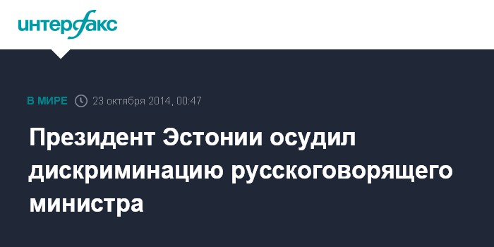Москва. 23 октября. INTERFAX.RU - Президент Эстонии Тоомас Хендрик Ильвес осудил дискриминирующие высказывания министра финансов Юргена Лиги по отношению к единственному в правительстве страны русскоговорящему министру, главе министерства образования и науки Евгению Осиновскому.