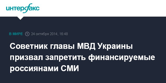 Москва. 24 октября. INTERFAX.RU - Советник главы МВД Украины Антон Геращенко считает целесообразным запретить вещание СМИ, которые имеют собственников в РФ.