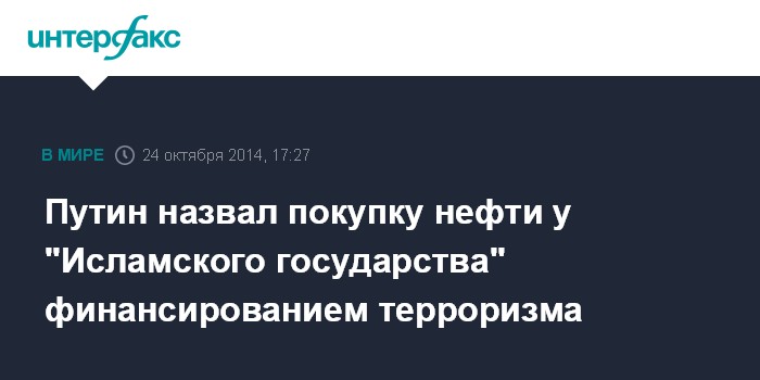 Москва. 24 октября. INTERFAX.RU - Боевики группировки "Исламское государство" пополняют свои финансовые ресурсы в том числе благодаря добыче нефти, которая развернута на захваченных ими территориях, заявил президент РФ Владимир Путин на встрече с членами клуба "Валдай" в пятницу.