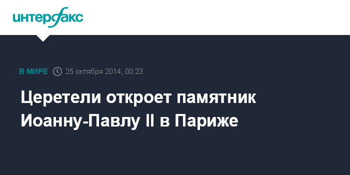 Москва. 25 октября. INTERFAX.RU - Скульптор Зураб Церетели откроет памятник папе римскому Иоанну-Павлу II в сквере собора Парижской Богоматери в субботу, 25 октября.