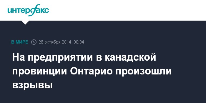 Москва. 26 октября. INTERFAX.RU - На предприятии в городе Сарния канадской провинции Онтарио произошли взрывы техногенного характера, сообщает в воскресенье канадский телеканал CBC.