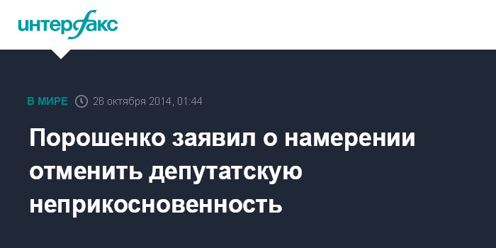 Москва. 26 октября. INTERFAX.RU - Президент Украины Петр Порошенко заявил о намерении в понедельник поднять вопрос об отмене депутатской неприкосновенности. Об этом он написал в своем твиттере.
