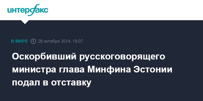 Москва. 26 октября. INTERFAX.RU - Министр финансов Эстонии Юрген Лиги, оскорбивший на национальной почве русскоговорящего министра образования и науки Евгения Осиновского, подал в отставку. Как сообщили "Интерфаксу" в пресс-службе правительства, глава Минфина сообщил об этом в воскресенье на встрече с премьер-министром Таави Рыйвасом.