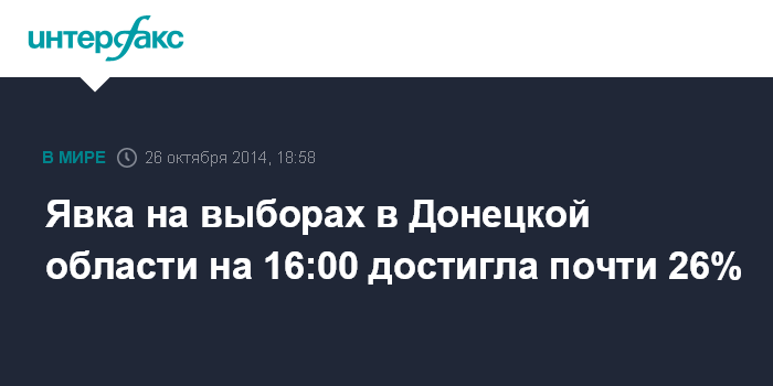 Москва. 26 октября. INTERFAX.RU - По состоянию на 16:00 (17:00 по Москве) явка избирателей в Донецкой области на работающих участках достигла почти 26%.