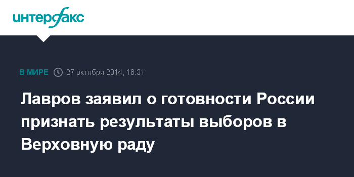 "Судя по всему, эти выборы состоялись. Думаю, что мы признаем (в будущем времени - ИФ) результаты этих выборов… Нам очень важно, чтобы на Украине наконец появилась власть, которая занимается не борьбой друг с другом, а реальными проблемами, которые перед страной стоят ", - сказал Лавров в интервью телеканалу Life News.