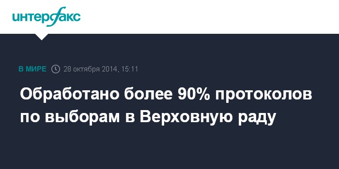 Москва. 28 октября. INTERFAX.RU - После обработки 90,02% протоколов, полученных Центризбиркомом от избирательных комиссий, на прошедших в воскресенье выборах в Верховную Раду Украины "Народный фронт" набирает 22,16% голосов, "Блок Петра Порошенко" - 21,77% голосов избирателей.