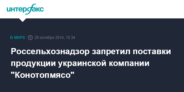 Москва. 28 октября. INTERFAX.RU - Федеральная служба по ветеринарному и фитосанитарному надзору РФ с 28 октября вводит временный запрет на ввоз в Россию мясной продукции ПАО "Конотопмясо" (Сумская область).