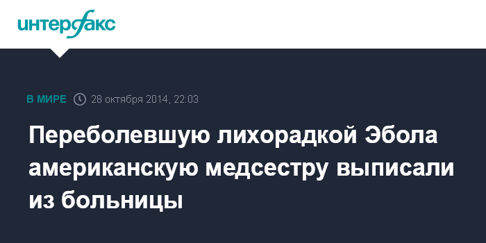 Москва. 28 октября. INTERFAX.RU - Медсестра Эмбер Винсон, заразившаяся лихорадкой Эбола от инфицированного пациента на территории США, выписана из больницы Атланты в штате Джорджия, пишет во вторник Washington Post.
