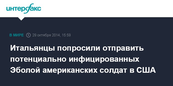 Москва. 29 октября. INTERFAX.RU - В Италии критически относятся к инициативе США поместить под карантин на итальянской территории американских военных, находившихся ранее в охваченной эпидемией Эболы Либерии, сообщает в среду итальянская газета Il Messaggero.