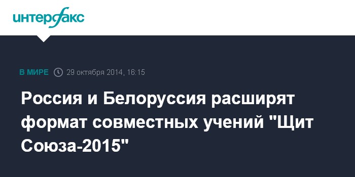 "В плане на 2015 год основным мероприятием боевой подготовки будут совместные учения "Щит Союза-2015", которые пройдут на полигонах России и Белоруссии. Здесь по предложению Сергея Кужугетовича (Шойгу) мы внесли некоторые изменения и расширили учебные вопросы, которые будут проработаны как в ходе проведения самих учений, так и перед ними", - сказал Жадобин журналистам в среду после заседания совместной коллегии министерств обороны России и Белоруссии.