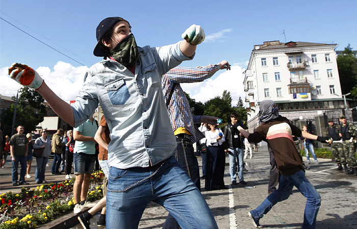 Пикет у здания российского посольства в Киеве начался вечером 14 июня, в нем принимали участие более 200 человек, которые призывали Россию прекратить вмешательство во внутренние дела Украины. Участники акции забрасывали здание яйцами и зеленкой, а также раскрасили табличку на здании дипмиссии в цвета украинского флага. По их словам, они не принадлежали к какой-либо конкретной организации и просто увидели сообщение об акции в соцсетях.