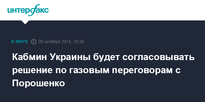 Москва. 30 октября. INTERFAX.RU - Решение Кабинета министров Украины по газовым переговорам с РФ будет согласовано с президентом страны Петром Порошенко, заявил премьер-министр Арсений Яценюк.