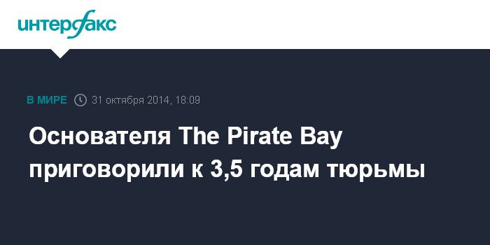 Москва. 31 октября. INTERFAX.RU - Суд в Копенгагене приговорил одного из основателей торрент-трекера The Pirate Bay, шведа Готтфрида Свартхольма, к 3,5 годам лишения свободы, сообщает Associated Press.