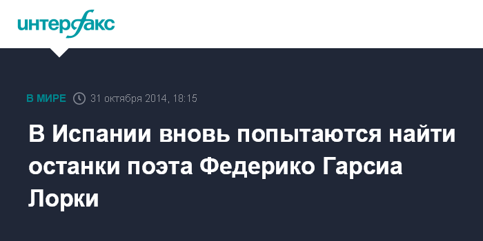 Москва. 31 октября. INTERFAX.RU - Испанские археологи в ноябре начнут раскопки в предполагаемом месте массового захоронения времен гражданской войны, где могут находиться останки убитого в 1936 году поэта Федерико Гарсиа Лорки, сообщает агентство Associated Press.