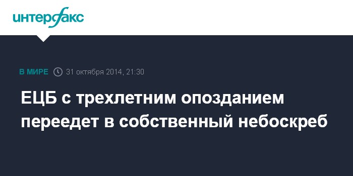 Москва. 31 октября. INTERFAX.RU - Европейский центральный банк (ЕЦБ) в ноябре, на три года позже намеченного срока, переедет в собственное новое здание, пишет Financial Times.
