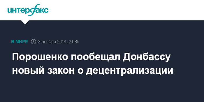Москва. 3 ноября. INTERFAX.RU - Украина готова будет принять новый закон о децентрализации, касающийся местного самоуправления в Луганской и Донецкой областях, но в случае соблюдения конфликтующими сторонами минского протокола, заявляет президент Петр Порошенко.