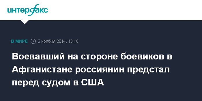 Москва. 5 ноября. INTERFAX.RU - В США начался судебный процесс над гражданином России, воевавшим на стороне боевиков в Афганистане и захваченным в 2009 году, сообщают в среду американские СМИ.