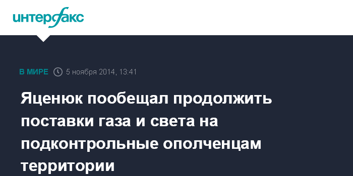 Москва. 5 ноября. INTERFAX.RU - Правительство Украины и дальше будет продолжать поставлять газ и электроэнергию на территории, находящиеся под контролем сторонников самопровозглашенных Донецкой и Луганской народных республик, не смотря на отсутствие оплаты, заявил премьер-министр Арсений Яценюк на заседании правительства в среду.