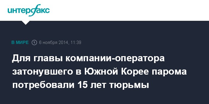 Москва. 6 ноября. INTERFAX.RU - Прокуроры в Южной Корее требуют для обвиняемого в катастрофе парома "Севол" директора компании-оператора Chonghaejin Marine Ким Хан Сика 15 лет лишения свободы, сообщают в четверг западные СМИ.