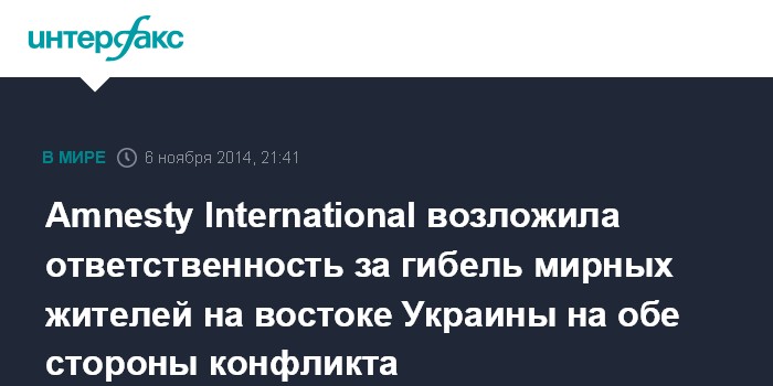 Москва. 6 ноября. INTERFAX.RU - Правозащитная организация Amnesty International по результатам исследовательской миссии (конец сентября - начало октября) заявила, что обе стороны конфликта на востоке Украины несут ответственность за неизбирательные атаки на густонаселенные пункты.
