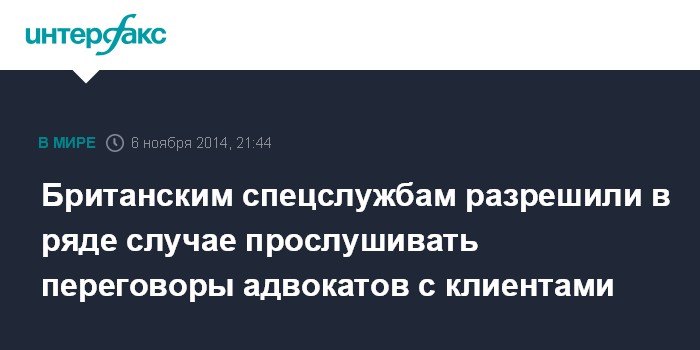 Москва. 6 ноября. INTERFAX.RU - Среди сотрудников британских спецслужб Великобритании - MI5, MI6 и Центра правительственной связи - распространили инструкцию, которая позволяет им при определенных обстоятельствах перехватывать переговоры между адвокатами и их подзащитными, сообщает в четверг агентство AP.