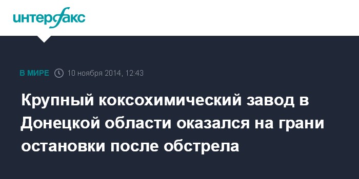 Москва. 10 ноября. INTERFAX.RU - Авдеевский коксохимический завод (АКХЗ, Донецкая область), входящий в группу "Метинвест", поздно вечером 8 ноября подвергся массированному артиллерийскому обстрелу, в результате чего были повреждены все три высоковольтные линии, питающие предприятие.