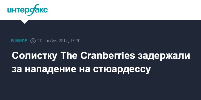 Москва. 10 ноября. INTERFAX.RU - Вокалистка ирландской группы The Cranberries Долорес О'Риордан была задержана после того, как, предположительно, напала на стюардессу, сообщает BBC News.