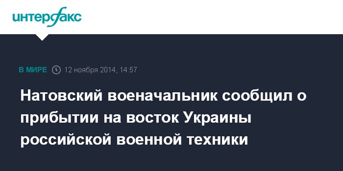 Москва. 12 ноября. INTERFAX.RU - В НАТО зафиксировали прибытие на восток Украины за последние два дня нескольких колонн с военной техникой и военными из России, заявил в среду командующий объединенными силами НАТО в Европе Филип Бридлав.