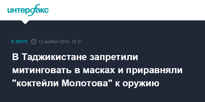 Москва. 12 ноября. INTERFAX.RU - В Таджикистане участвовать в митингах и шествиях с закрытым лицом, будь то маска или капюшон, а также иностранным гражданам теперь запрещено, согласно принятым поправкам в закон "О собраниях, митингах и уличных шествиях", сообщила в среду пресс-служба Маджлиси Оли (парламента).
