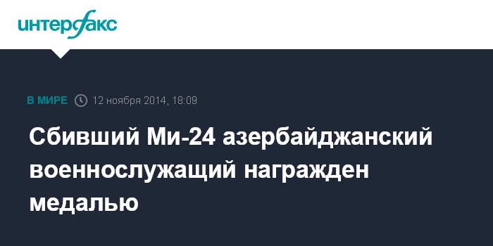 Москва. 12 ноября. INTERFAX.RU - Азербайджанский военнослужащий, сбивший в среду армянский вертолет, представлен к награде приказом министра обороны страны Закира Гасанова, сообщает пресс-служба Минобороны.