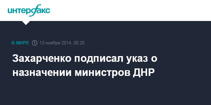Москва. 13 ноября. INTERFAX.RU - Глава самопровозглашенной Донецкой Народной Республики Александр Захарченко подписал указ "О кадровых назначениях членов Совета Министров Донецкой Народной Республики", сообщает официальный сайт пресс-центра Правительства и Народного Совета ДНР.