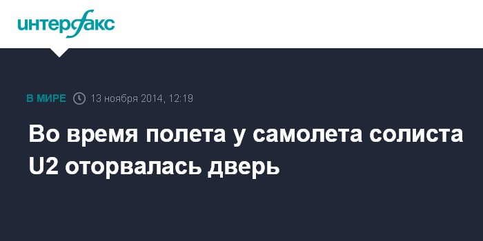 Москва. 13 ноября. INTERFAX.RU - У самолета, на котором летел лидер группы U2 Боно, во время полета оторвалась дверь, пишет The Daily Mail.