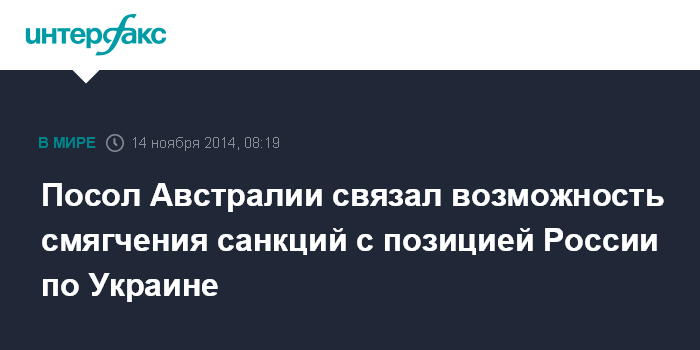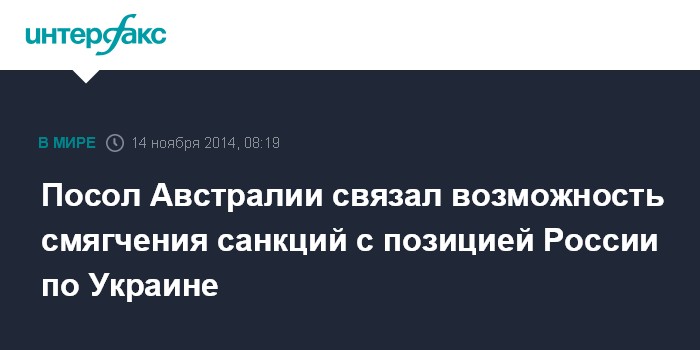 Москва. 14 ноября. INTERFAX.RU - Австралийский посол в Москве Пол Майлер обусловил возможность ослабления введенных его страной санкций в отношении России изменением российской политики в отношении Украины.