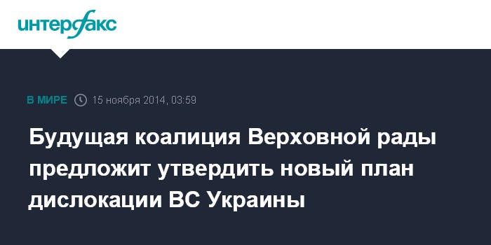 Москва. 15 ноября. INTERFAX.RU - Члены будущей коалиции в Верховной Раде предлагают закрепить в соглашении положения о новом военно-административном делении Украины и пересмотреть расположения мест постоянной дислокации частей Вооруженных Сил Украины.