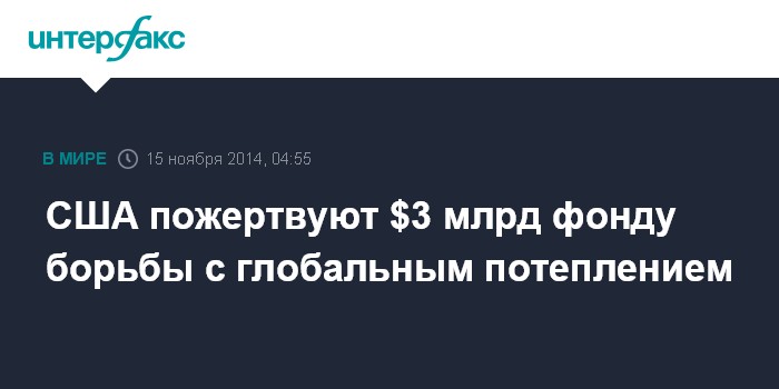 Москва. 15 ноября. INTERFAX.RU - Президент США Барак Обама заявил о готовности внести $3 миллиарда в фонд ООН, призванный помочь бедным странам бороться с пагубными последствиями глобального потепления, сообщило агентство Bloomberg.