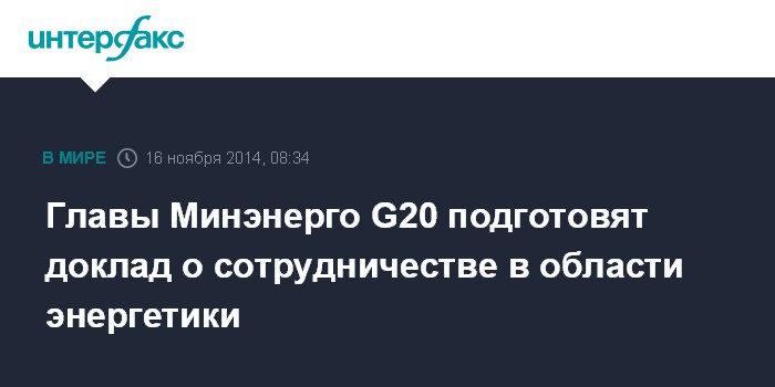 "Углубление сотрудничества в области энергетики имеет приоритетное значение. Мировые энергетические рынки переживают существенную трансформацию. Сегодня мы одобряем Принципы G20 по сотрудничеству в области энергетики, поручаем нашим министрам энергетики представить нам в 2015 году доклад относительно вариантов дальнейшего проведения работы в этой области", - говорится в итоговом коммюнике саммита "большой двадцатки" в Брисбене.