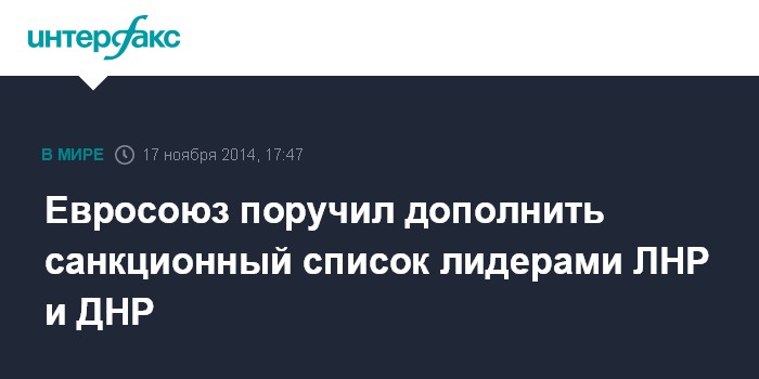 Москва. 17 ноября. INTERFAX.RU - Совет Европейского союза по иностранным делам в понедельник поручил европейской внешнеполитической службе и Еврокомиссии к концу ноября разработать предложения по расширению санкционного списка за счет лидеров самопровозглашенных Донецкой и Луганской народных республик (ДНР и ЛНР).