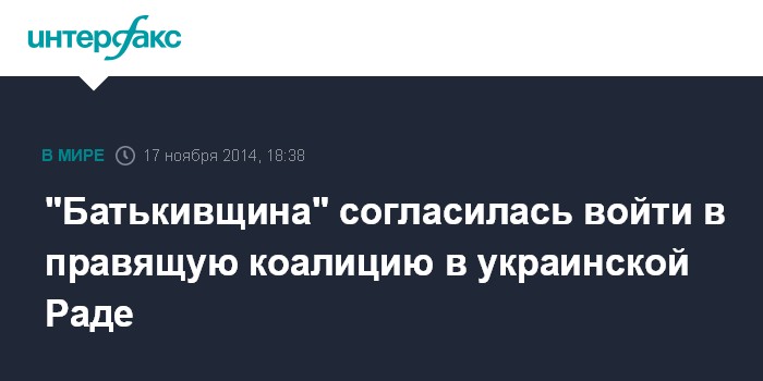 Москва. 17 ноября. INTERFAX.RU - Политсовет партии "Батькивщина" принял решение о вхождении партийной фракции в правящую коалицию в Верховной Раде Украины VIII созыва.