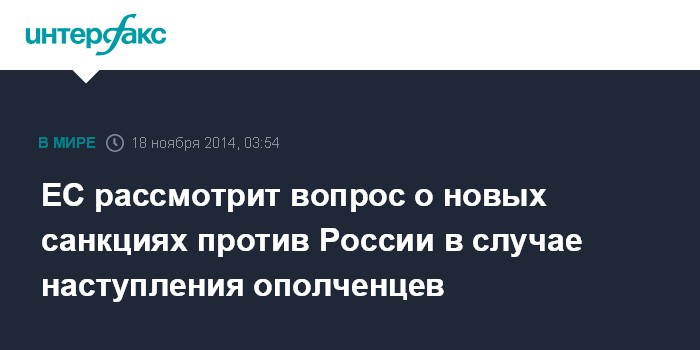 Москва. 18 ноября. INTERFAX.RU - Евросоюз может обсудить усиление экономических санкций в отношении России на саммите в декабре, если ополченцы самопровозглашенных Донецкой и Луганской народных республик (ДНР, ЛНР) попытаются взять под свой контроль новые территории, сообщила газета "Коммерсант" со ссылкой на источник в структурах ЕС.