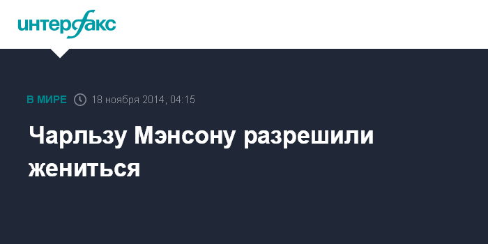 Москва. 18 ноября. INTERFAX.RU - Серийный убийца Чарльз Мэнсон получил разрешение на брак с 26-летней женщиной, которая посещала его в тюрьме, сообщило во вторник агентство Associated Press.