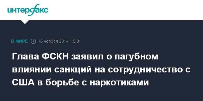Москва. 18 ноября. INTERFAX.RU - Обмен данными с США по вопросам борьбы с наркотрафиком продолжается, но объем сотрудничества снизился в десятки раз из-за западных санкций, сообщил глава ФСКН Виктор Иванов.