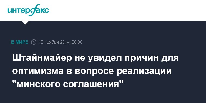 Москва. 18 ноября. INTERFAX.RU - Глава МИД Германии Франк-Вальтер Штайнмайер не видит причин для оптимизма в вопросе реализации Минского протокола по Украине, но в то же время выступает против отказа от него.