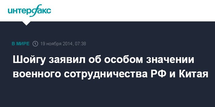 Москва. 19 ноября. INTERFAX.RU - В условиях постоянно усложняющейся международной обстановки военное и военно-техническое сотрудничество между Россией и Китаем приобретает особое значение, заявил в среду министр обороны РФ Сергей Шойгу во время встречи с заместителем председателя Центрального военного совета КНР генерал-полковником Сюй Циляном в государственной резиденции "Дяоюйтай".