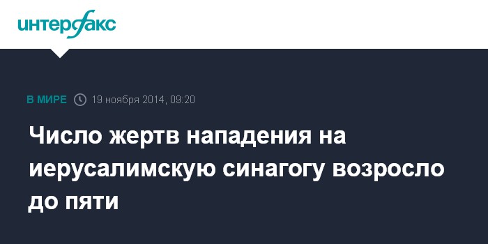 Во вторник двое вооруженных палестинцев совершили нападение на синагогу в Иерусалиме. Ранее сообщалось о гибели четырех человек, в том числе - троих граждан США. Оба нападавших также были убиты. Ответственность за теракт взяла на себя группировка Народный фронт освобождения Палестины.
