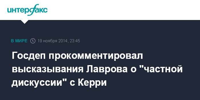 Москва. 19 ноября. INTERFAX.RU - Госдепартамент США выражает сожаление в связи с тем, что глава МИД России Сергей Лавров предал огласке детали частной дипломатической дискуссии с госсекретарем США Джоном Керри. Об этом сообщил представитель ведомства Джефф Ратке.