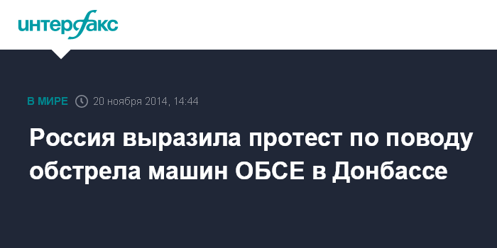 Москва. 20 ноября. INTERFAX.RU - Россия выразила протест в связи с обстрелом в Донбассе машин специальной миссии ОБСЕ на Украине.