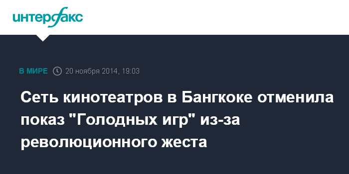 Москва. 20 ноября. INTERFAX.RU - Сеть кинотеатров в Бангкоке отменила показ фильма "Голодные игры: Сойка-пересмешница. Часть 1" из-за планов студентов провести акцию протеста перед демонстрацией фильма. Об этом сообщает Bangkok Post.