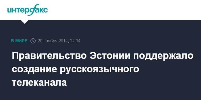 Москва. 20 ноября. INTERFAX.RU - Кабинет министров Эстонии на заседании в четверг принял принципиальное решение поддержать создание русскоязычного телеканала в структуре Эстонской общественной телерадиовещательной корпорации, сообщили в правительстве страны.