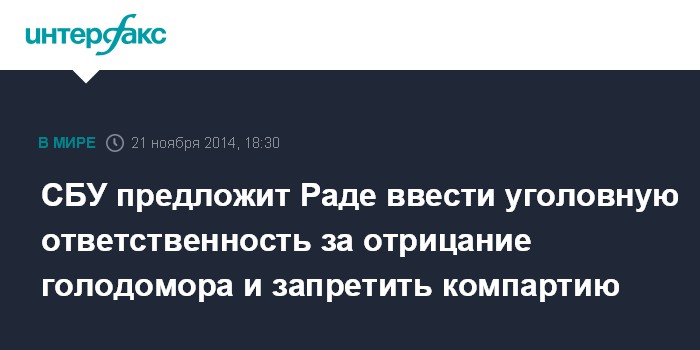 Москва. 21 ноября. INTERFAX.RU - Служба безопасности Украины намерена предложить новому составу парламента установить уголовную ответственность за отрицание голодомора и запретить коммунистическую партию, заявил глава СБУ Валентин Наливайченко.