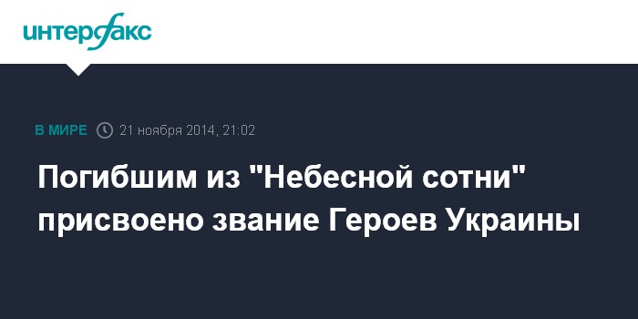 Москва. 21 ноября. INTERFAX.RU - Президент Украины Петр Порошенко в пятницу вечером подписал указ, которым присвоил звание Героя Украины жертвам Майдана, вошедших в так называемую "Небесную сотню", сообщил пресс-секретарь главы государства Святослав Цеголко.